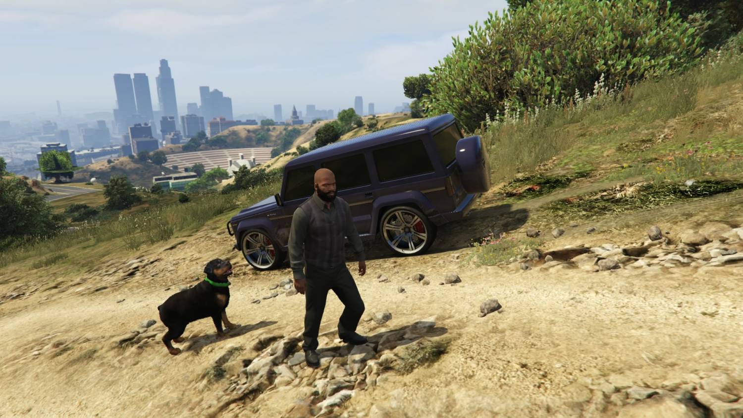 Синий тонированный Гелендваген, перед городом Винивуд, Франклин в строгом костюме и его собака Чеп.
